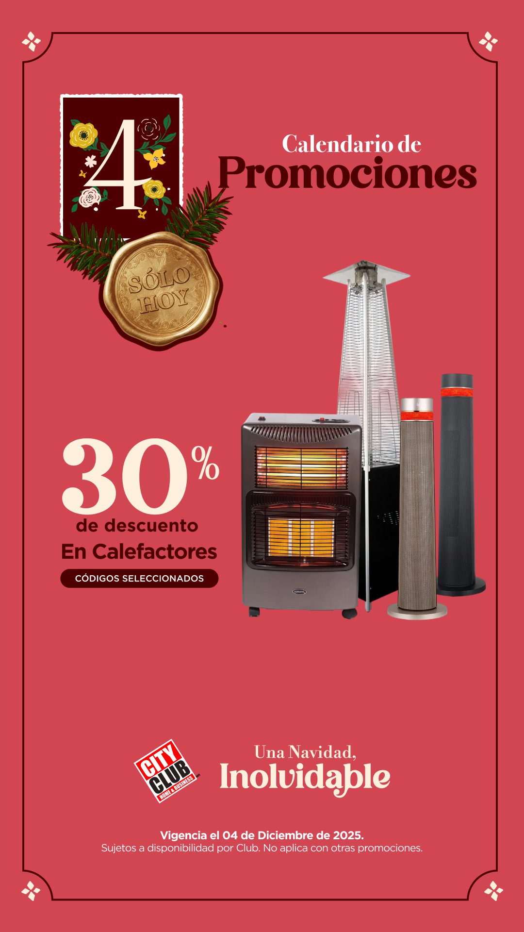 Únicamente por el día de hoy jueves 04 de diciembre de 2025, estará la promoción Calendario de Promociones de los clubes de precios City Club, con al que te están ofreciendo un 30% de descuento en Calefactores; la promoción aplica en códigos seleccionados, es válida en su tienda en línea www.cityclub.com.mx y en sus clubes físicos.