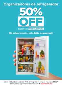 Apenas estoy viendo la promoción No está Chiquito, solo falta Organizarlo de las tiendas de autoservicio Waldos, en la que encontrarás un 50% de descuento Organizadores para Refrigerador (tienen productos desde $50.00) + Envíos Gratis en tus compras superiores a $399.99; la promoción aplica en productos seleccionados, es válida de manera exclusiva en su tienda en línea waldos.com.mx y estará vigente del 03 al 09 de marzo de 2025.