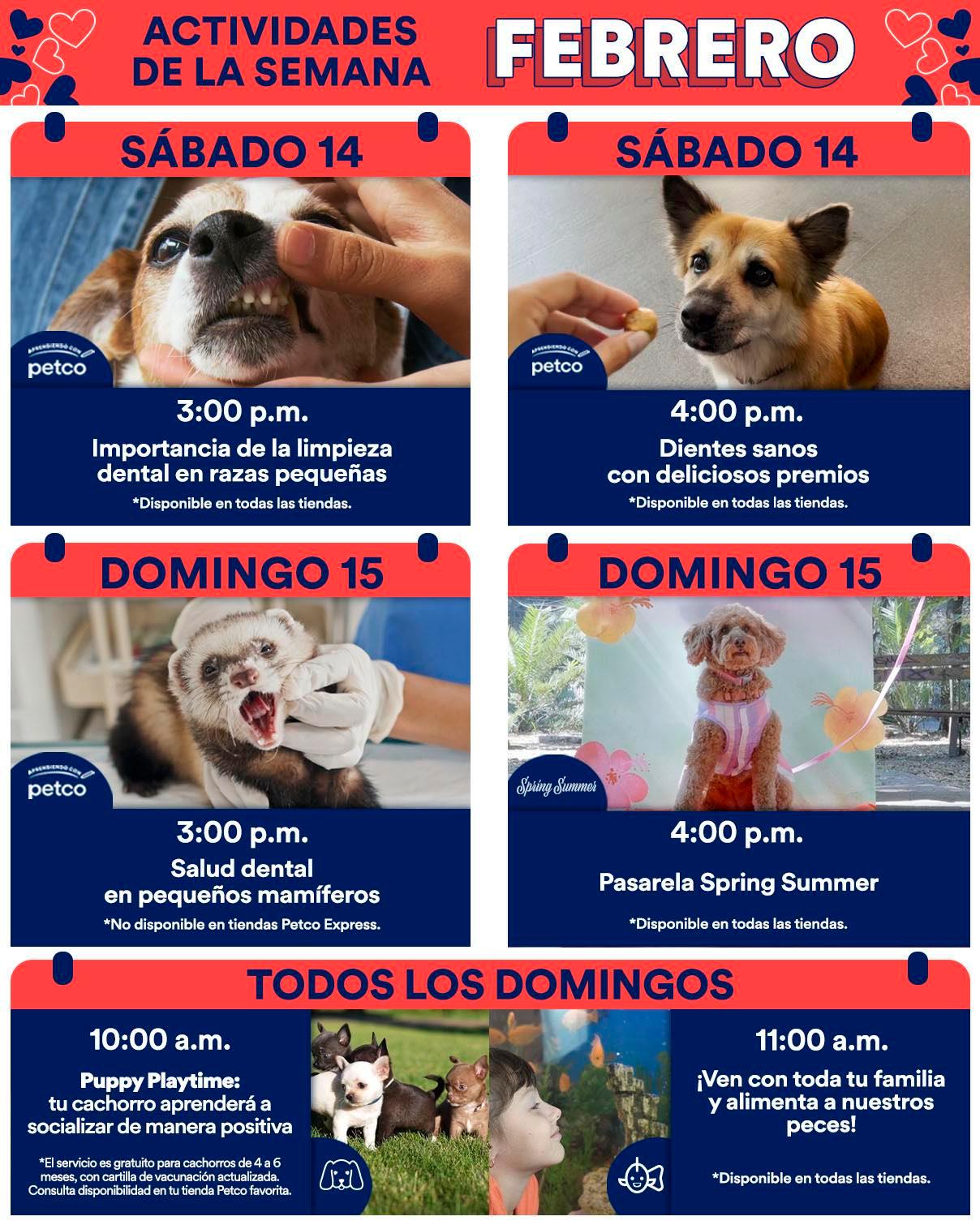 - Domingo 15: Salud Dental en Pequeños Mamíferos; se realizará en sus tiendas a las 15:00 horas. No estará disponible en tiendas Petco Express