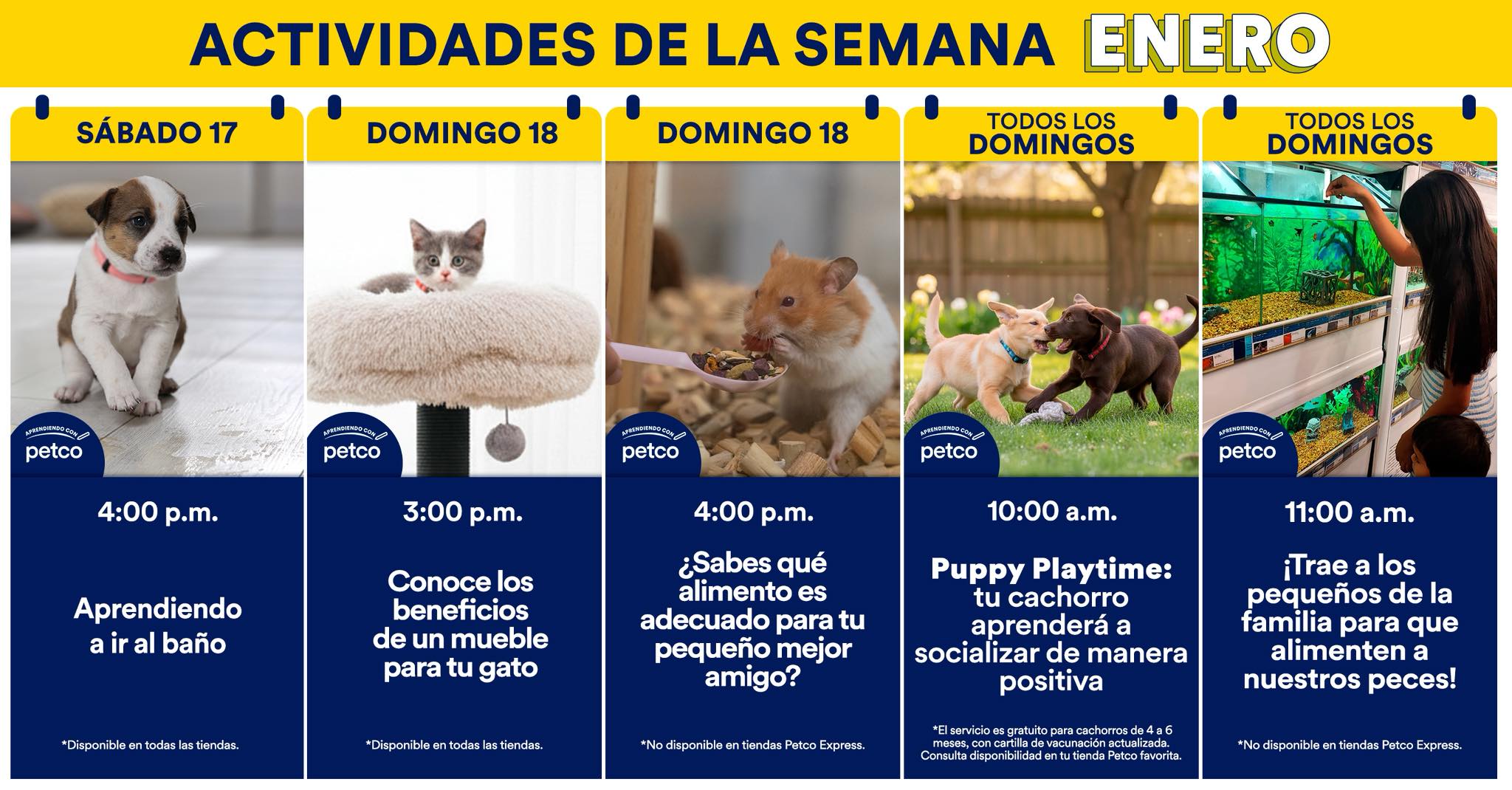 En las tiendas de productos para mascotas Petco, el sábado 17 y el domingo 18 de enero de 2026, impartirán los Seminarios GRATUITOS Aprendiendo con Petco: Aprendiendo a ir al baño; Conoce los beneficios de un mueble para tu Gato y ¿Sabes qué alimento es adecuado para tu pequeño mejor amigo?; los seminarios se impartirán a las 15:00 y 16:00 horas en sus sucursales físicas: