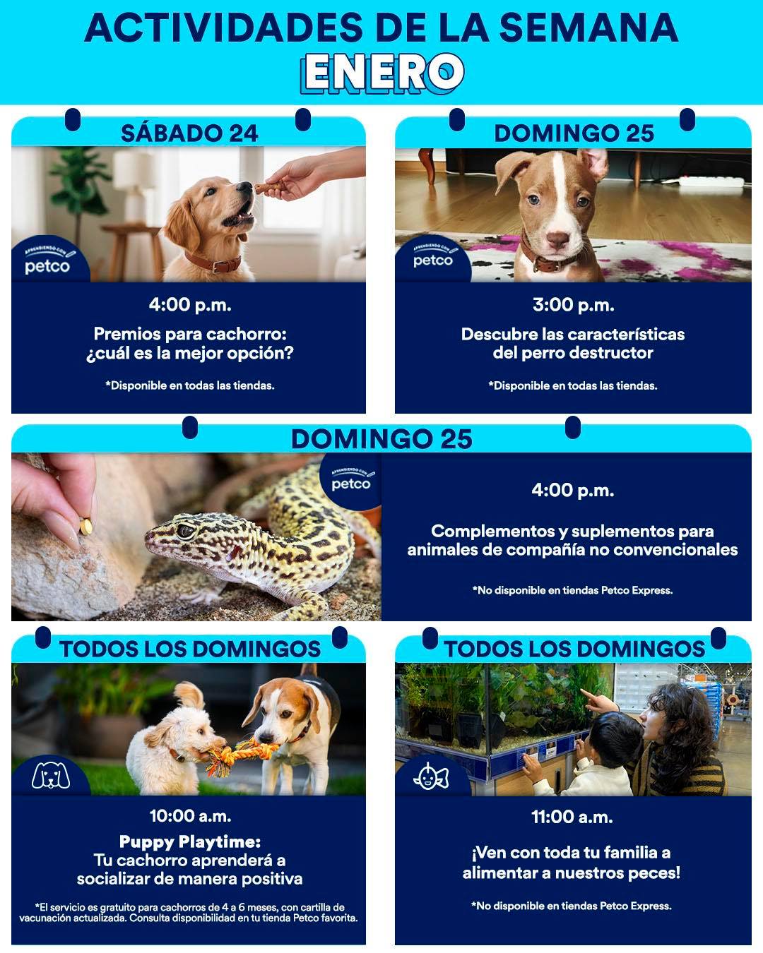 En las tiendas de productos para mascotas Petco, el sábado 24 y el domingo 25 de enero de 2026, impartirán los Seminarios GRATUITOS Aprendiendo con Petco: Premios para el Cachorro, ¿cuál es la mejor opción?; Descubre las características del Perro Destructor y Complementos y Suplementos para animales de compañía no convencionales; los seminarios se impartirán a las 15:00 y 16:00 horas en sus sucursales físicas: