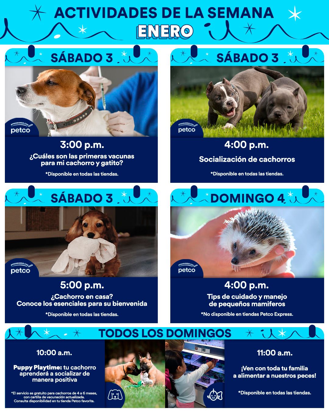 - Domingo 04: Tips de Cuidado y Manejo de Pequeños Mamíferos; se efectuará a las 16.00 horas en sus sucursales físicas. No estará disponible en tiendas Petco Express