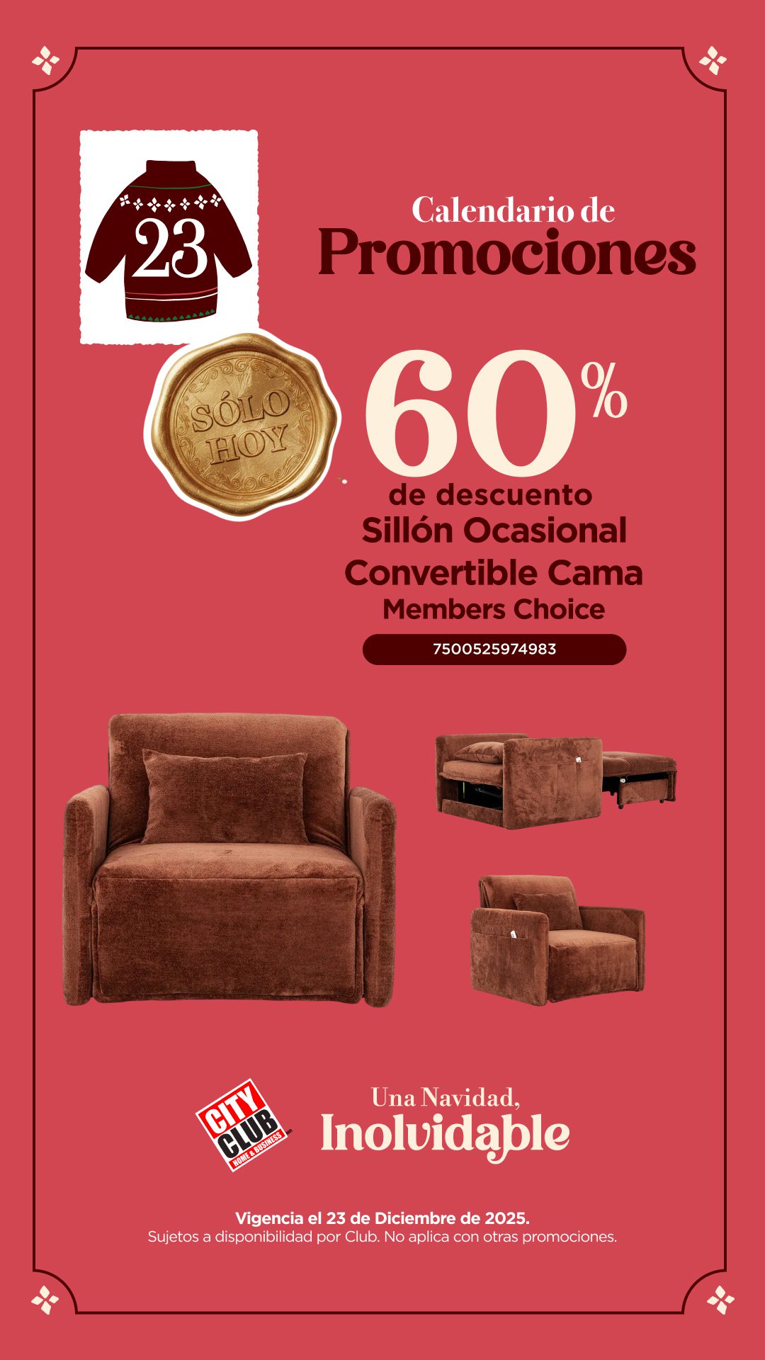 Solo por el día de hoy martes 23 de diciembre de 2025, estará la promoción Calendario de Promociones de los clubes de precios City Club, con al que te están ofreciendo un 60% de descuento en Sillón convertible a Cama Member’s Choice; la promoción aplica en códigos seleccionados, es válida en su tienda en línea www.cityclub.com.mx y en sus clubes físicos.