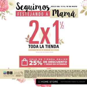 La promoción Seguimos Festejando a Mamá de The Home Store, te ofrece un 2×1½ en toda la tienda física (el descuento aplica en el producto de igual o menor precio) ó un 25% de descuento + Meses sin intereses en su tienda en línea https://bit.ly/3sAT0hk; la promoción cuenta con una vigencia del 13 al 16 de mayo de 2022 y es válida solo para clientes que pertenezcan a su Círculo Home Store. Si todavía no perteneces al Círculo Home Store, te puedes registrar en esa misma página de Internet).