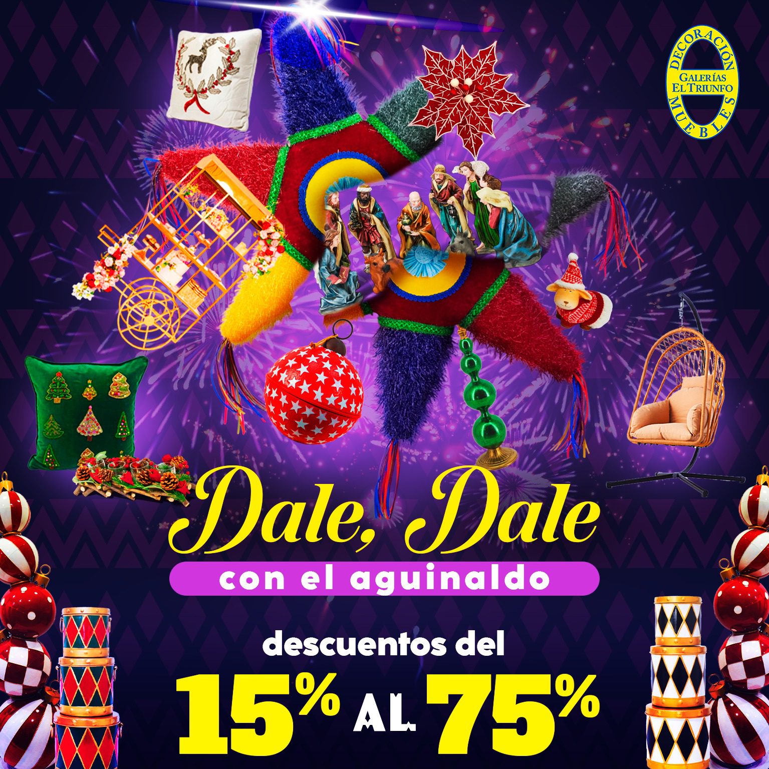 Ya está aquí la promoción Dale, Dale con el aguinaldo de las tiendas especializadas en muebles, decoración y regalos Galerías El Triunfo, en la que encontrarás descuentos del 15% y hasta del 75% en toda la tienda; la promoción es válida en sus sucursales físicas (que puedes ubicar en este enlace: galeriaseltriunfo.com/sucursales/) y en su tienda en línea galeriaseltriunfo.com y estará vigente del 16 al 24 de diciembre de 2025.
