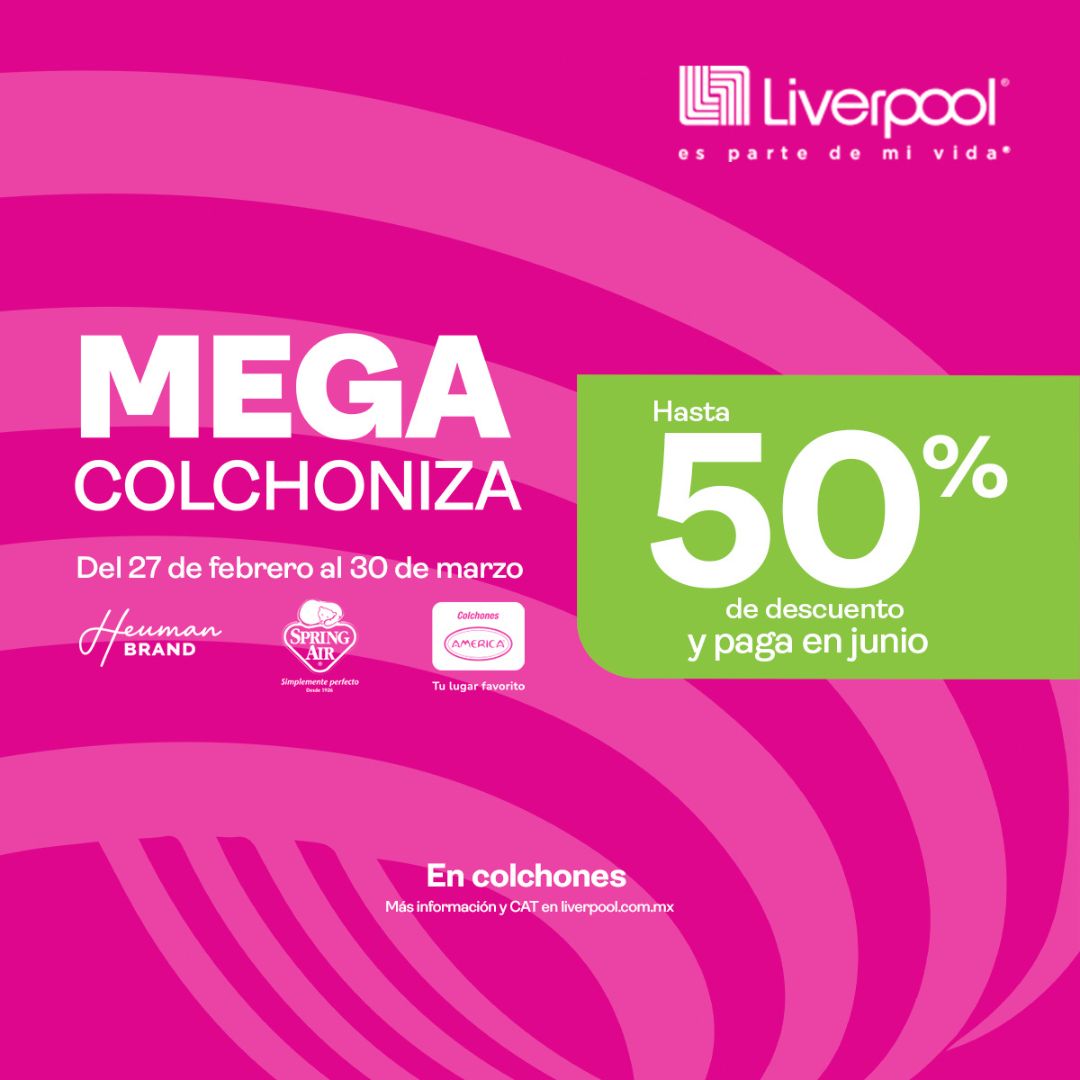 A partir del 27 de febrero y hasta el 30 de marzo de 2026, estará la Mega Colchoniza de las tiendas departamentales Liverpool, en la que encontrarás hasta un 50% de descuento en Colchones seleccionados, y Pagas en Junio 2026; la promoción es válida en su tienda en línea liverpool.com.mx y en sus sucursales físicas.