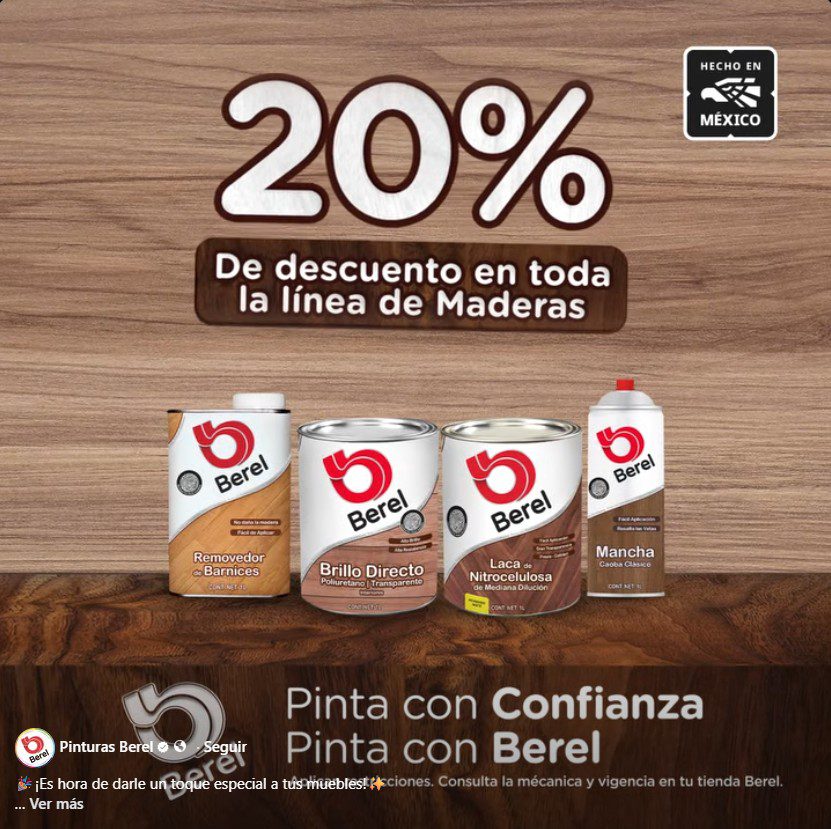 La promoción ¡Es hora de darle un toque especial a tus muebles! de las pinturas Berel, te ofrecen un 20% de descuento en toda su línea de Maderas (desde Manchas al Aceite hasta Esmaltes); la promoción aplica productos participantes, tiene una vigencia del 02 al 31 de marzo de 2026 y es válida en sus sucursales físicas (puedes ubicar la más cercana a tu domicilio en este enlace: berel.com.mx).
