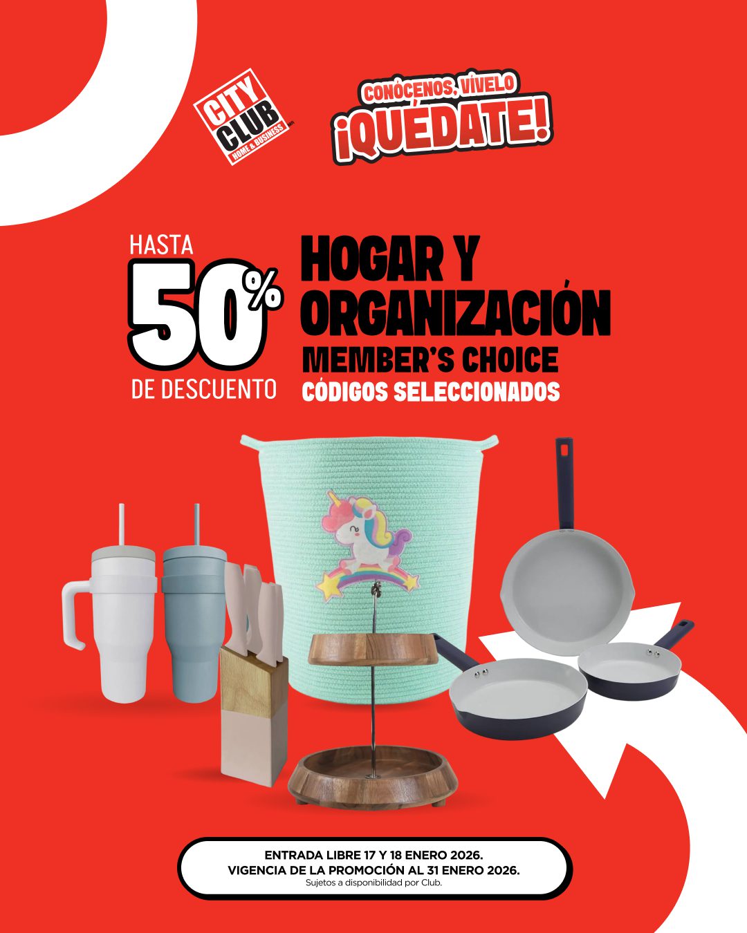 Hace un instante vi la promoción Conócenos, Vívelo, ¡Quédate! de los clubes de precios City Club, en la que te ofrecen hasta un 50% de descuento en Hogar y Organización Member’s Choice; la promoción aplica en códigos seleccionados, es válida en su tienda en línea www.cityclub.com.mx y en sus clubes físicos y estará vigente hasta el 31 de enero de 2026.