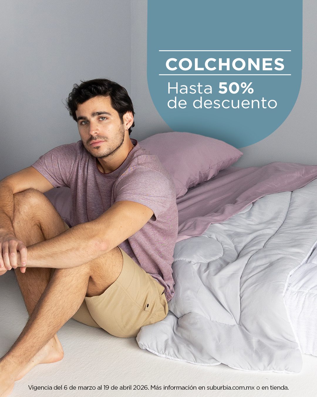 Desde el 06 de marzo y hasta el 19 de abril de 2026 o hasta agotar existencias, estará la promoción Tu descanso ideal empieza aquí de las tiendas departamentales Suburbia, en la que encontrarás hasta un 50% de descuento en Colchones; la promoción aplica en artículos seleccionados, es válida en su tienda en línea suburnia.com.mx, en su App (que puedes descargar desde esa misma página) y en sus sucursales físicas.
