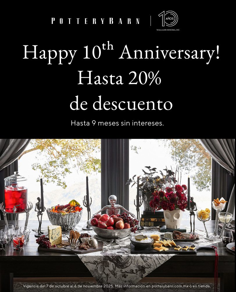 Acabo de darme cuenta que las tiendas de muebles para el hogar Pottery Barn, de muebles y accesorios West Elm y de cocina y muebles para el hogar Williams Sonoma, con la promoción de su 10 Aniversario, te darán hasta un 20% de descuento + hasta 9 Meses sin intereses; la vigencia de la promoción es del 07 de octubre al 06 de noviembre de 2025 y es válida en sus sucursales físicas y en sus tiendas en línea: