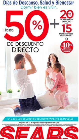 Ahorita está la promoción Días de Descanso en Sears por si quieren cambiar su colchón. Están dando hasta 50% de descuento + 20% adicional + 15 Meses Sin Intereses o 10% adicional al pagar con Tarjeta de Crédito Sears. Esta promoción es válida en colchones participantes del departamento de muebles. La vigencia es del 22 de agosto al 18 de septiembre del 2018.