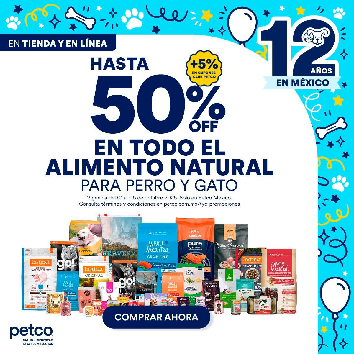 Ya inició la promoción de Aniversario, 12 Años en México de las tiendas de productos para mascotas Petco, en la que del 01 al 06 de octubre de 2023, te estarán dando hasta un 50% de descuento en Alimento natural y más; la promoción es válida en su tienda en línea https://petco.com.mx/aniversario, en su App (que puedes descargar desde eses mismo sitio) y en sus sucursales físicas. Estas son algunas de sus ofertas: