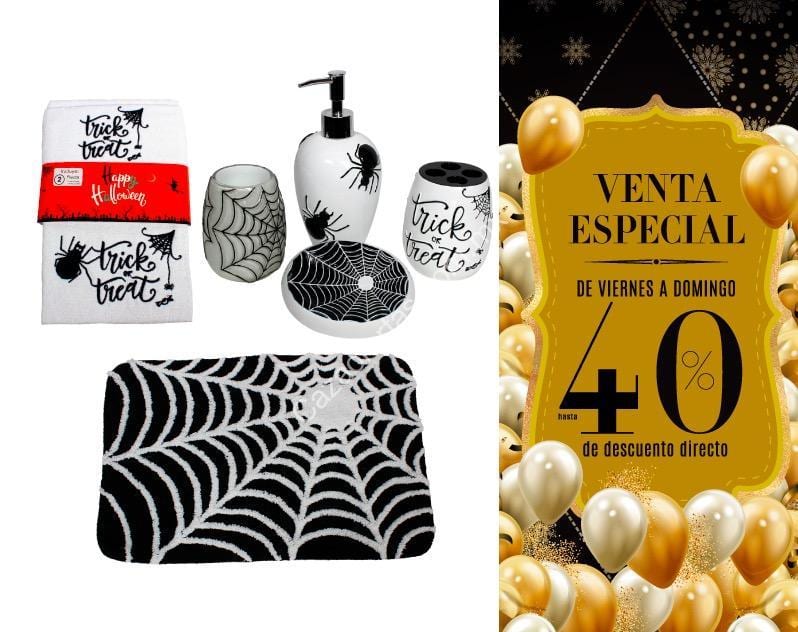 Otra tienda que tiene promociones este fin de semana es The Home Store. Encontraremos hasta 40% de descuento en varias artículos por su Venta Especial de Halloween. La promoción estará vigente de este viernes 13 al domingo 15 de octubre. Hay un juego de baño muy completo que consta de una toalla, un tapete, un frasco para jabón líquido de manos y un porta cepillos de dientes con diseño de Halloween. Todas las tiendas participan.