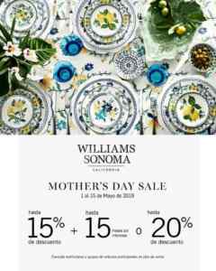 Williams-Sonama tiene en estos momentos una venta del Día de las Madres que seguirá vigente hasta el miércoles 15 de mayo de 2019 con las siguientes promociones: