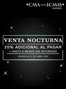 Hasta el domingo 21 de abril de 2024, en las mueblerías Casa de las Lomas estará su Venta Nocturna, en la que encontrarás hasta un 20% de descuento adicional al pagar, hasta 6 Meses sin intereses con tarjetas participantes; la promoción es válida en su sitio web casadelaslomas.com y en sus sucursales físicas.