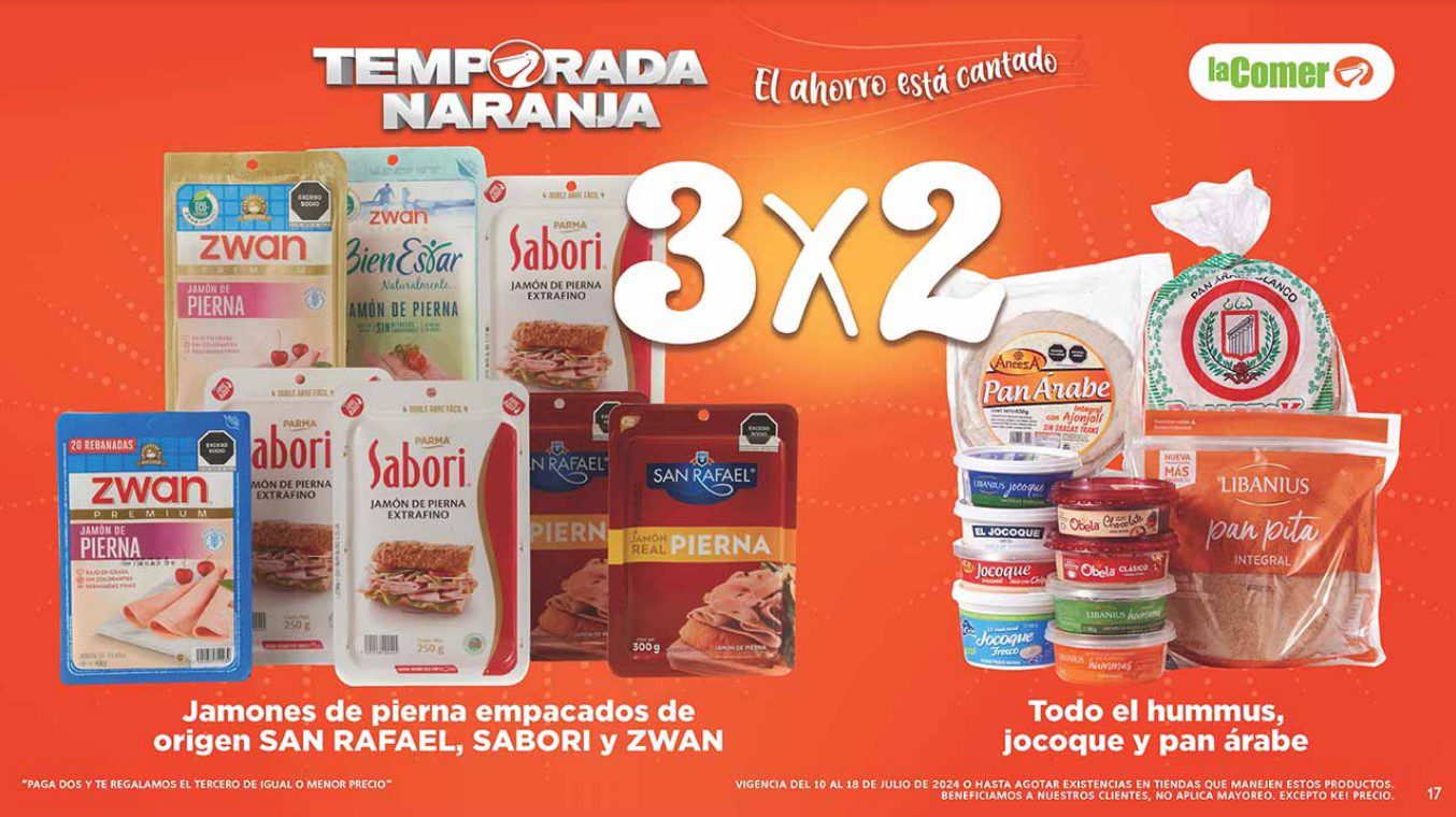Te comparto el folleto Temporada Naranja, El Ahorro está Cantando de La Comer y Fresko, que contiene sus ofertas válidas del 10 al 18 de julio de 2024 o hasta agotar existencias y en el que encontrarás 2×1, 3×2, 4×2, 4×3 (los productos Gratis serán los de igual o menor precio), Bonificaciones en tu Monedero Naranja en la compra de determinados importes, Descuentos especiales en tus compras por cada determinado importe y Precios especiales en productos seleccionados; las ofertas son válidas en su tienda en línea: https://www.lacomer.com.mx/ y en sus sucursales físicas. Te detallo solo algunas ofertas y al final te dejo el folleto completo: