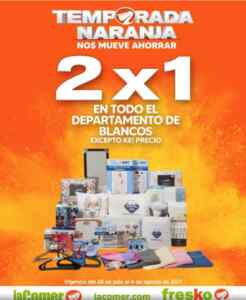 Acabo de ver que con su promoción de la Temporada Naranja, en La Comer y Fresko te darán un 2×1 en todo el departamento de Blancos (excepto Ke! Precio); la promoción es válida en sus sucursales físicas y en su tienda en línea lacomer.com con una vigencia del 28 de julio al 04 de agosto de 2021.