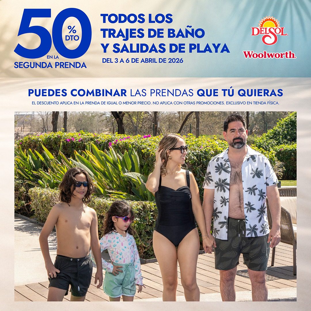 Únicamente por el día de hoy lunes 06 de abril de 2025, en las tiendas departamentales Del Sol y Woolworth con su promoción El Mood de Vacaciones empieza por el traje de baño, te estarán dando un 50% de descuento en la Segunda prenda de todos los Trajes de Baño y Salidas de playa (el descuento aplica en la prenda de menor precio); la promoción aplica en productos participantes, es válida solo en sus sucursales físicas y puedes combinar las prendas que tú quieras.