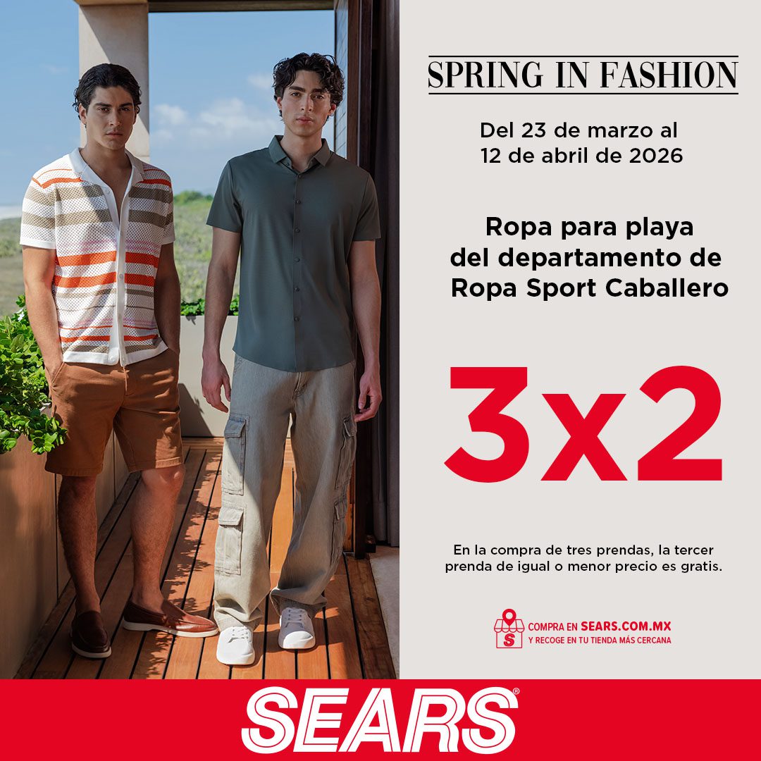 Ya inició la promoción Dale un giro a tu clóset de las tiendas departamentales Sears, en las que te estarán dando un 3×2 en Ropa para Playa del departamento de Ropa Sport Caballero (el producto Gratis será el de igual o menor precio); las ofertas aplican en mercancía de precio regular y son válidas de manera exclusiva en su tienda en línea sears.com.mx, y en sus sucursales físicas y estarán vigentes del 23 de marzo al 12 de abril de 2026.