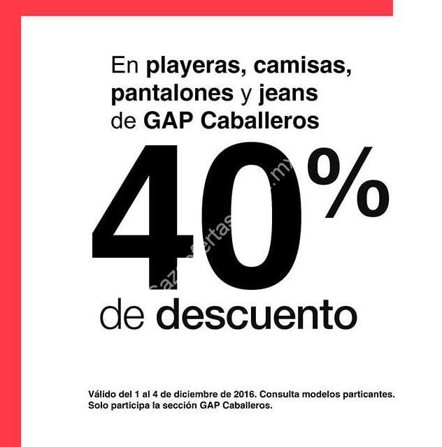 Les comparto una promoción más de fin de semana. En tiendas GAP tienen con un 40% de descuento las playeras, camisas, pantalones y jeans para caballero (no participa damas). La promoción muy probablemente también la tienen en tiendas Liverpool. Vigencia: 4 de diciembre.