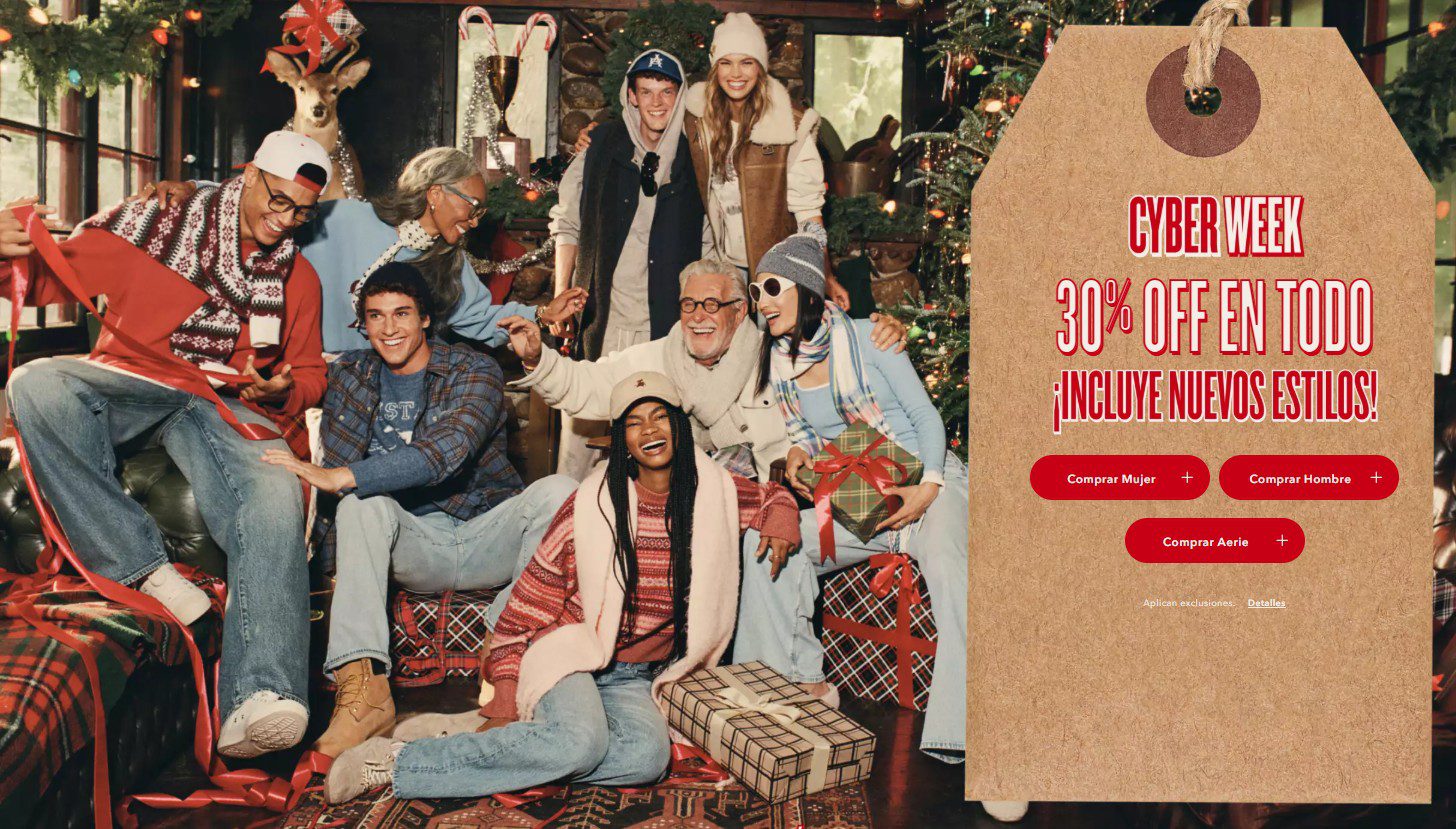 La promoción del Cyber Week de las tiendas de ropa y accesorios American Eagle y de ropa íntima Aerie, te estará dando un 30% de descuento en todo; la promoción estará vigente hasta las 05:00 horas del 04 de diciembre de 2025 y es válida en su sitio de Internet www.ae.com/mx/es y en su App (que puedes descargar en esa misma página).