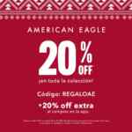 Te comento que en las tiendas de ropa y accesorios de moda y de ropa íntima American Eagle y Aerie, hay una promoción exclusiva de su sitio web ae.com/mx, en la que están dando un 20% de descuento en toda la tienda si usas el código REGALOAE y además puedes obtener un 20% de descuento adicional si realizas tu compra en su App (que puedes descargar en este enlace: ae.com); la vigencia de la promoción es del 02 al 08 de diciembre de 2021.