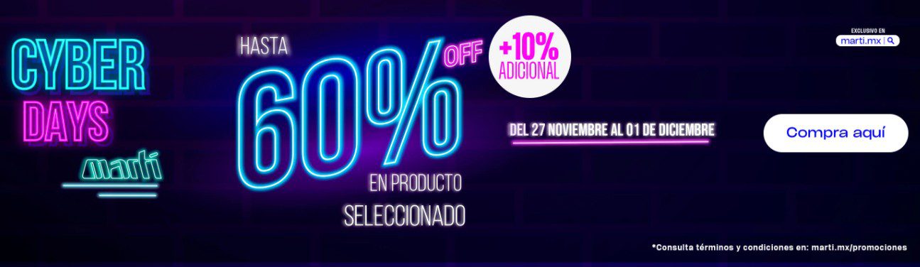 Estoy viendo la promoción de los Cyber Days de la tienda de ropa, calzado, accesorios y equipos deportivos Martí, en la que te ofrecen hasta un 60% de descuento en la productos seleccionados + un 10% adicional a lo ya rebajado; la promoción aplica en artículos participantes, es válida exclusivamente en su tienda en línea www.marti.mx/rebajas y en su App Martí Go (que puedes descargar desde esa misma página) y estará vigente del 27 de noviembre al 01 de diciembre de 2025.