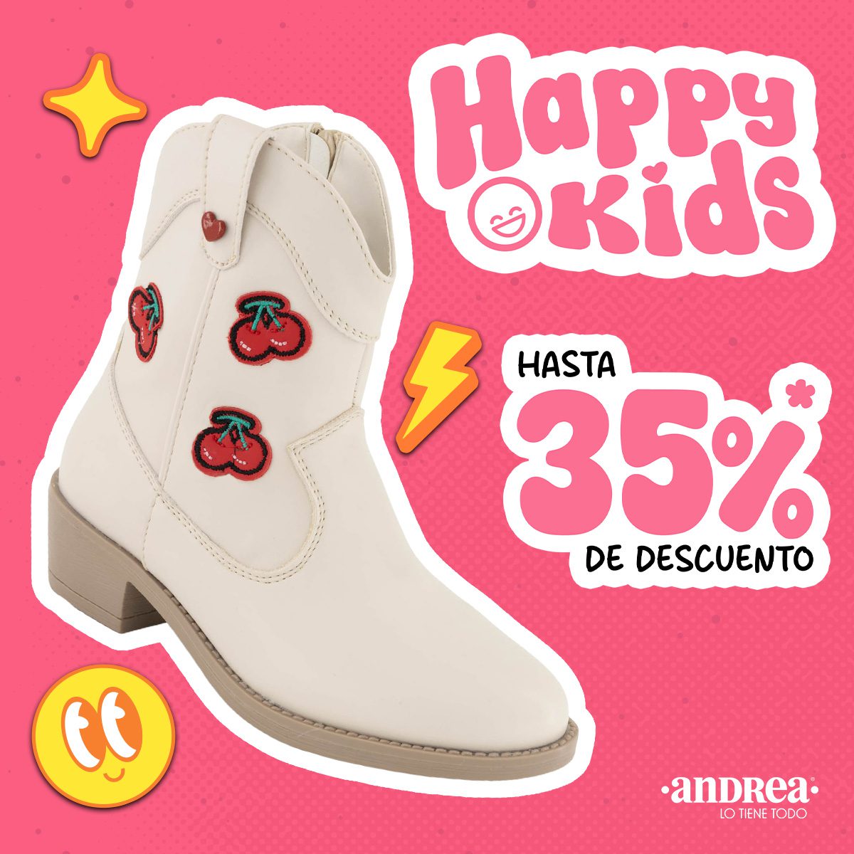 Hace un instante vi la promoción Happy Kids por el Día del Niño, de la tienda de zapatos, ropa, accesorios de moda Andrea, en la que estarán dando hasta un 35% de descuento en calzado para Niños; la promoción aplica en productos seleccionados de las marcas Andrea Kids y Andrea Baby, es válida en su página de Internet mx.andrea.com y estará vigente del 01 al 30 de abril de 2026 o hasta agotar el inventario seleccionado de 9,300 unidades o lo que suceda primero.
