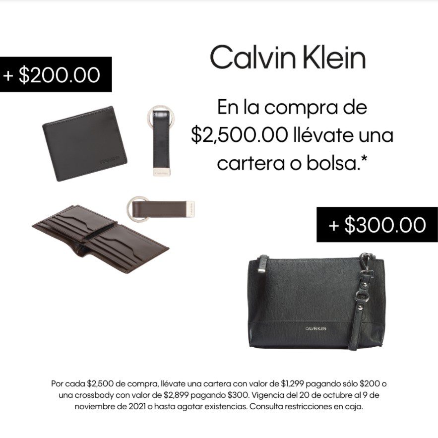 La marca de ropa, mochilas, zapatos y accesorios Calvin Klein tienen una promoción en la que si realizas una compra por un mínimo de $2,500.00, por $200.00 más recibirás una Cartera con valor de $1,299.00 ó por $300.00 adicionales te llevarás una Bolsa con valor de $2,899.00; la promoción tiene una vigencia del 20 de octubre al 09 de noviembre 2021 o hasta agotar existencias.