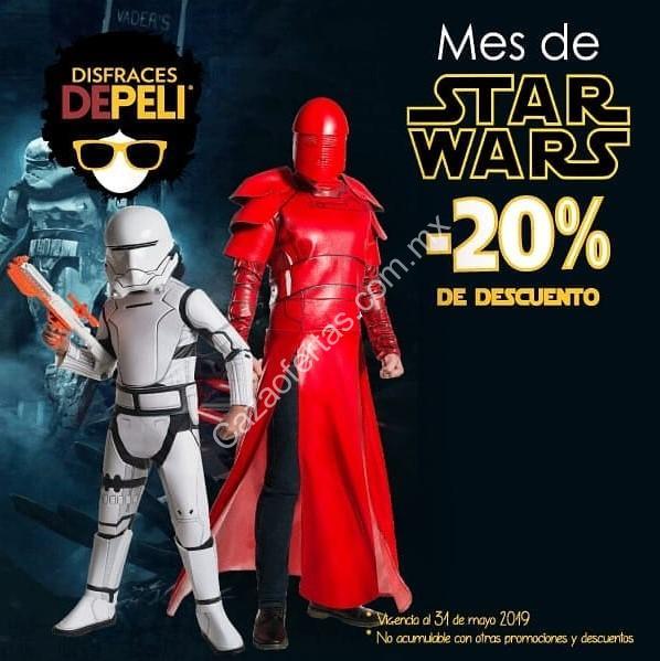 Te comento que en Disfraces de Peli vi que tienen una promoción en los disfraces de Star Wars; los puedes obtener con un 20% de descuento hasta el 31 de mayo de 2019 y es válido tanto en sus sucursales físicas como en su tienda en línea: https://www.disfracesdepeli.com/