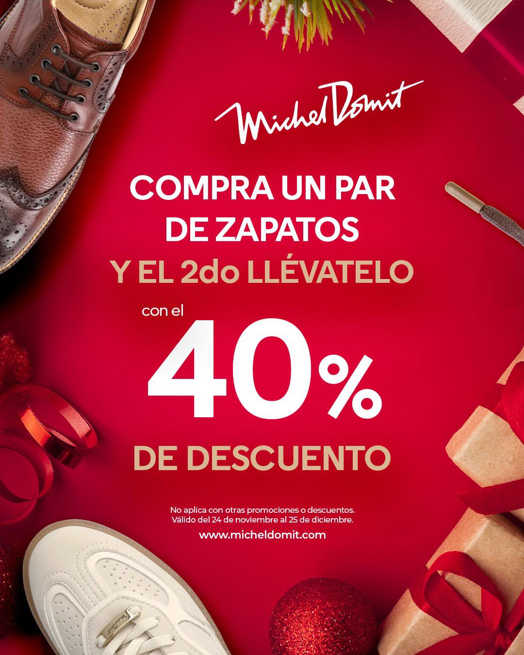 Estoy viendo que las tiendas especializadas en calzado Michel Domit con su promoción ¡Te llevas más por menos!, te ofrecen que, si realizas la compra de un Par de Zapatos, te llevarás el Segundo Par con un 40% de descuento; la promoción aplica en productos seleccionados, estará vigente del 24 de noviembre al 25 de diciembre de 2025 y aplica en su página de Internet www.micheldomit.com y en sus sucursales físicas.