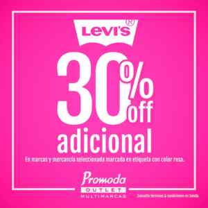 En las tiendas de ropa, calzado y accesorios Promoda Outlet hay una promoción en la que te están ofreciendo un 30% de descuento adicional en mercancía seleccionada de la marca Levis y etiquetada en color Rosa; la promoción es válida en sus sucursales físicas (puedes ubicar la sucursal más cercana a tu domicilio en esta liga: https://promoda.com.mx/tiendas).