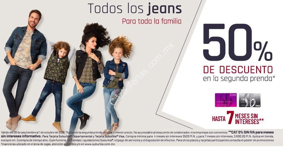 Las tiendas Suburbia están manejando 2do jeans que compren a mitad de precio toda esta semana. Aplica para los departamentos de hombre, mujer e infantiles para que pueda estrenar toda la familia. Pregunten por marcas y modelos participantes. Esta promoción estará vigente hasta el 1 de octubre del 2018. También pueden liquidar a 7 Meses Sin Intereses haciendo compras mínimas de $600 pesos y pagando con Tarjetas Suburbia.