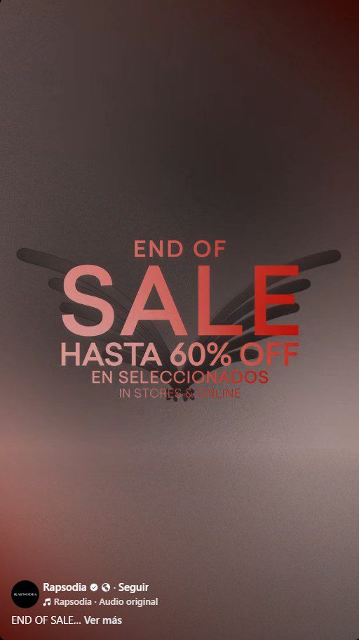 Hace un momento me percaté que en la tienda de ropa, calzado y accesorios Rapsodia con su promoción End of Sale, te estará dando hasta un 60% de descuento; la promoción aplica en estilos seleccionados con etiqueta de rebaja, tiene una vigencia del 19 al 29 de enero de 2026 y es válida en sus Boutiques físicas y en su página de Internet www.rapsodia.com.mx.