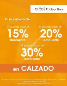 Cloe tiene esta promoción por si tienen pensado comprar varios pares de zapatos, entre más compren, más descuento recibirán. Si compran 2 piezas se llevan un 15% de descuento sobre el total, 20% en la compra de 3 y 30% en la compra de 4. Tienen hasta el 15 del mes de septiembre. El descuento no es acumulable con otras promociones