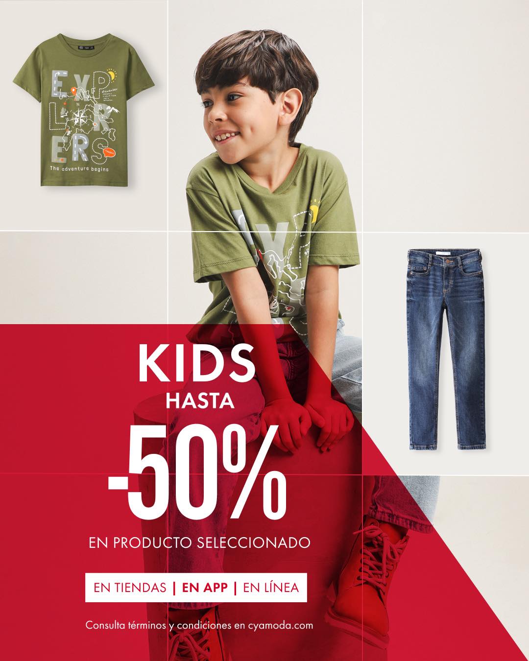 En las tiendas de ropa, calzado y accesorios de moda C&A está su promoción El look de tus Kids, en la que te están ofreciendo hasta un 50% de descuento en artículos seleccionados de Niños; la promoción aplica en productos participantes, es válida en sus sucursales físicas y en su sitio web www.cyamoda.com/promociones/descuento/, y estará vigente del 04 al 08 de marzo de 2026.