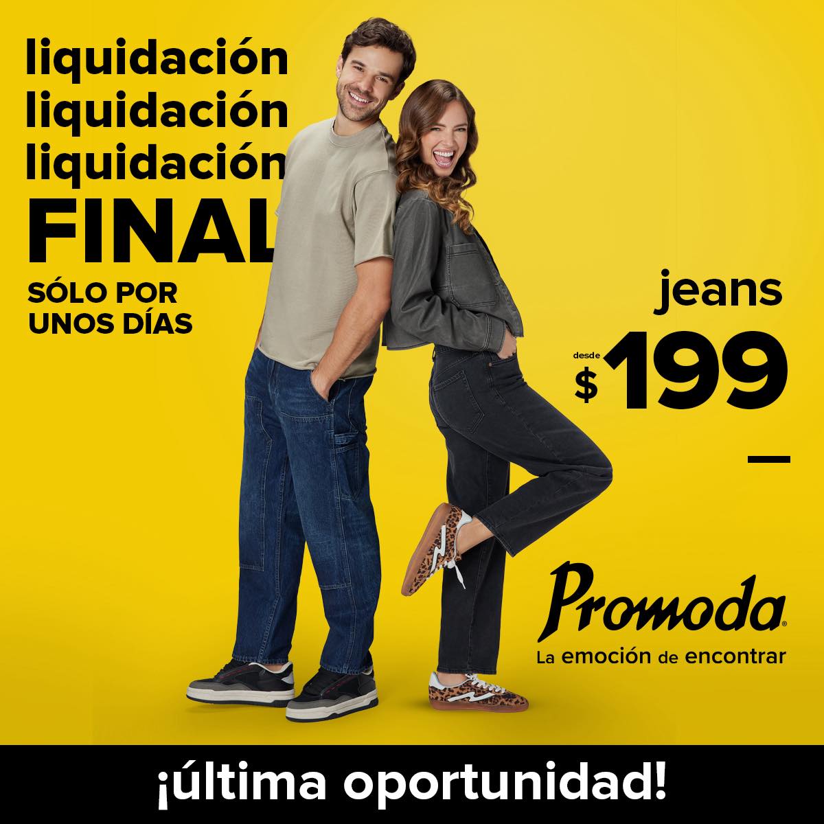 Las tiendas de ropa, calzado y accesorios de moda Promoda publicaron su promoción Liquidación Final, en la que encontrarás Jeans desde $199.00; la promoción es válida en sus tiendas Promoda (puedes ubicar la más cercana a tu domicilio en este link: https://promoda.com.mx/tiendas), aplica en productos participantes.