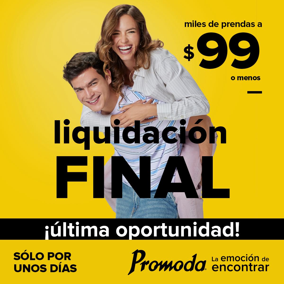 Las tiendas de ropa, calzado y accesorios de moda Promoda publicaron su promoción Liquidación Final, en la que encontrarás Miles de prendas a $99.00 o menos; la promoción es válida en sus tiendas Promoda (puedes ubicar la más cercana a tu domicilio en este link: https://promoda.com.mx/tiendas), aplica en productos participantes de Ropa, Calzado y Accesorios.