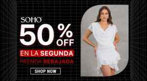 Las tiendas de ropa de moda para mujeres Soho anunciaron una Venta de Liquidación en la que te darán un 50% de descuento en tu Segunda prenda ya Rebajada; la promoción es válida en su página de Internet de la que aquí te comparto el enlace: soho.com.mx
