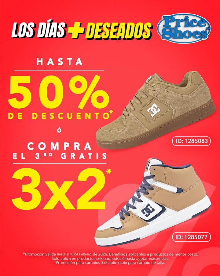 Las tiendas de ropa, calzado, joyería y electrónicos Price Shoes, con su promoción de Los Días más deseados, te ofrecen hasta un 50% de descuento ó un 3×2 (el producto Gratis será el de menor precio); la promoción aplica en productos seleccionados, es válida en sus sucursales físicas y estará vigente hasta el 16 de febrero de 2026 o hasta agotar existencias.