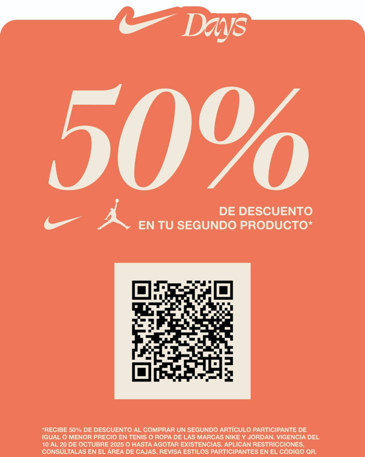 La promoción Nike Days de las tiendas de sneakers, accesorios y ropa casual Innvictus, te ofrece que, en la compra de 1, te darán un 50% de descuento en el Segundo producto (el descuento aplica en el producto de igual o menor precio); la promoción aplica en Tenis o Ropa de las marcas Nike y Jordan, estará vigente del 10 al 20 de octubre de 2025 o hasta agotar existencias, y es válida en sus sucursales físicas.
