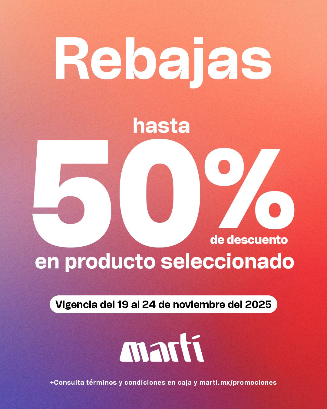 Estoy viendo la promoción de las Nuevas Rebajas de la tienda de ropa, calzado, accesorios y equipos deportivos Martí, en la que te ofrecen hasta un 50% de descuento; la promoción aplica en productos participantes, es válida en su tienda en línea www.marti.mx/rebajas, en su App Martí Go (que puedes descargar desde esa misma página) y en sus sucursales físicas (que puedes ubicar en éste enlace: marti.mx/ubicacion-de-tiendas) y estará vigente del 19 al 24 de noviembre de 2025.