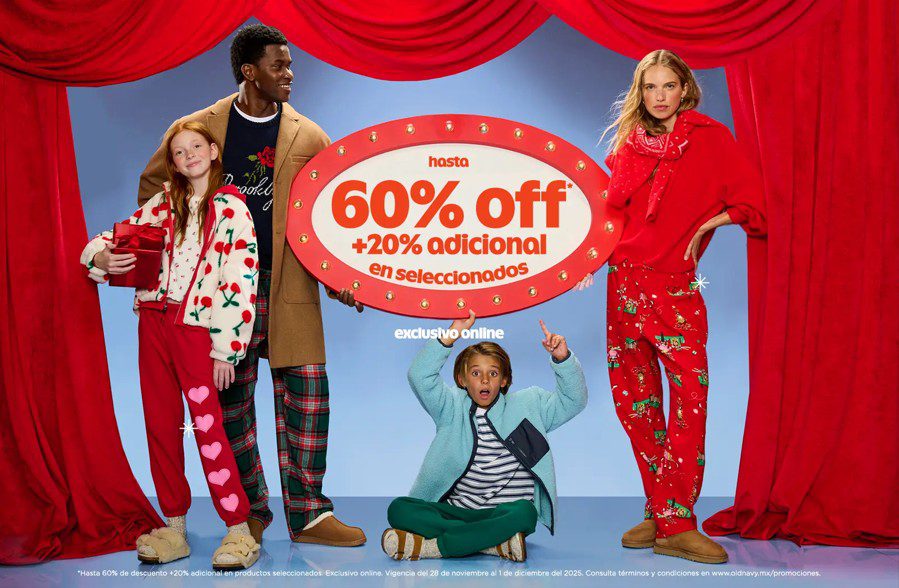 En esta oportunidad, las tiendas de ropa, calzado y accesorios de moda Old Navy, con su promoción del Cyber Week, te ofrecen hasta un 60% de descuento + un 20% de descuento adicional en productos seleccionados marcados con la etiqueta de descuento y/o precio final marcado; la promoción estará vigente del 28 de noviembre al 01 de diciembre de 2025, aplica en productos participantes y es válida solo en su tienda en línea oldnavy.mx.