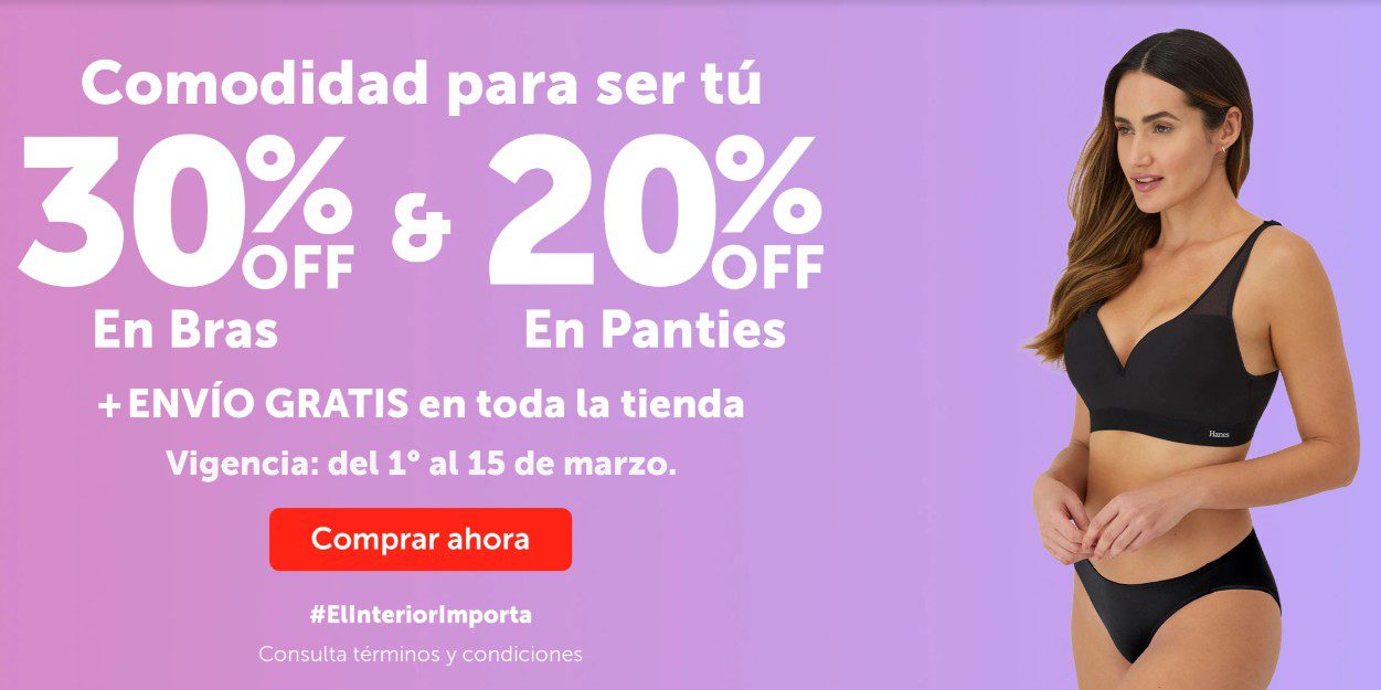 En las tiendas de ropa para toda la familia Hanes, con su promoción Comodidad para ser Tú, te estarán dando un 30% de descuento en Bras y un 20% de descuento en Panties; la promoción aplica en productos participantes, es válida en su sitio web www.hanes.mx y estará vigente del 01 al 15 de marzo de 2026.