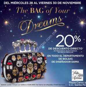 Si aún no saben qué regalar esta navidad, aprovechen la promoción Bag of Your Dreams de Saks Fifth Avenue. Esta semana están dando 20% de descuento directo en bolsas de diseñador para dama. Visiten el departamento de bolsas y pregunten por los modelos participantes. Las sucursales se encuentran en Plaza Carso y Centro Comercial Santa Fe.