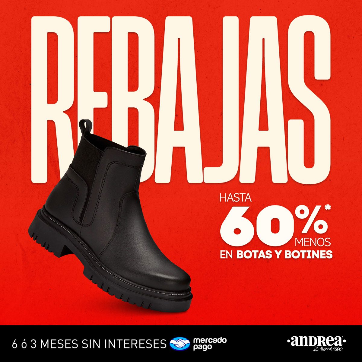 Estoy viendo la promoción de las Rebajas de la tienda de zapatos, ropa, accesorios de moda Andrea, en la que encontrarás hasta un 60% de descuento en Botas y Botines de las marcas Andrea y Ferrato + hasta 6 meses sin intereses si pagas con Mercado Pago; la promoción aplica en artículos seleccionados, es válida en su tienda en línea mx.andrea.com y en sus sucursales físicas, y estará vigente del 01 al 31 de enero de 2026 o hasta agotar el inventario seleccionado o lo que suceda primero.