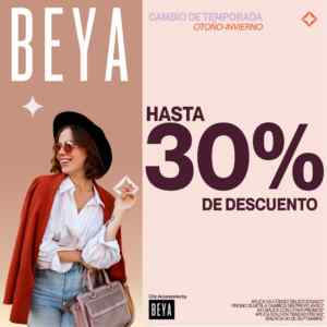 Estoy viendo que en las tiendas de joyería, relojería, bisutería y accesorios de moda Beya está su promoción Rebajas por Cambio de Temporada Otoño – Invierno, en la que te están ofreciendo hasta un 30% de descuento; la promoción aplica en productos seleccionados, es válida solo en sus sucursales físicas (puedes ubicar la más cercana a tu domicilio en el siguiente link: beya.mx/sucursales) y estará vigente hasta el 30 de septiembre de 2023.