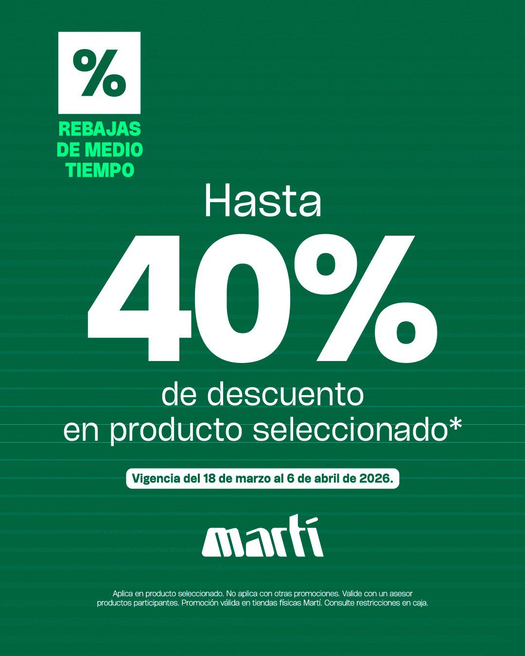Estoy viendo la promoción de Rebajas de Medio Tiempo de la tienda de ropa, calzado, accesorios y equipos deportivos Martí, en la que te ofrecen hasta un 40% de descuento; la promoción aplica en productos participantes sin descuento, es válida en su tienda en línea www.marti.mx/rebajas, en su App Martí Go (que puedes descargar desde esa misma página) y en sus sucursales físicas (que puedes ubicar en éste enlace: marti.mx/ubicacion-de-tiendas) y estará vigente del 18 de marzo al 06 de abril de 2026.