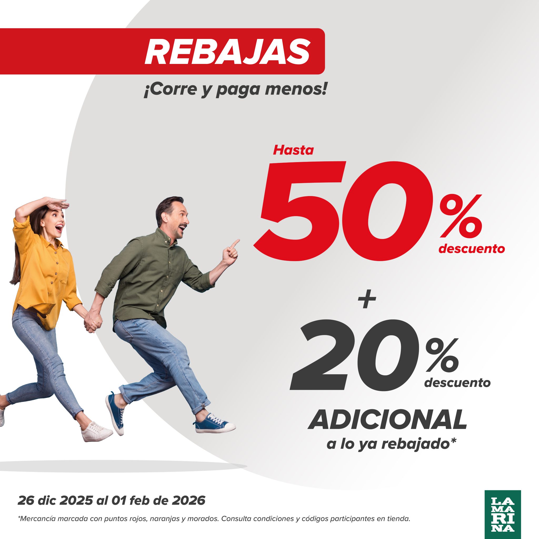 En las tiendas departamentales La Marina con su promoción de Rebajas, te estarán dando hasta un 50% de descuento + un 20% de descuento adicional en mercancía marcada con puntos Rojos, Naranjas y Morados; la promoción estará vigente del 26 de diciembre 2025 al 01 de febrero de 2026 hasta agotar existencias, aplica en productos seleccionados y es válida en sus sucursales físicas (puedes ubicar la más cercana a tu domicilio en este enlace: www.lamarina.com.mx/stores).