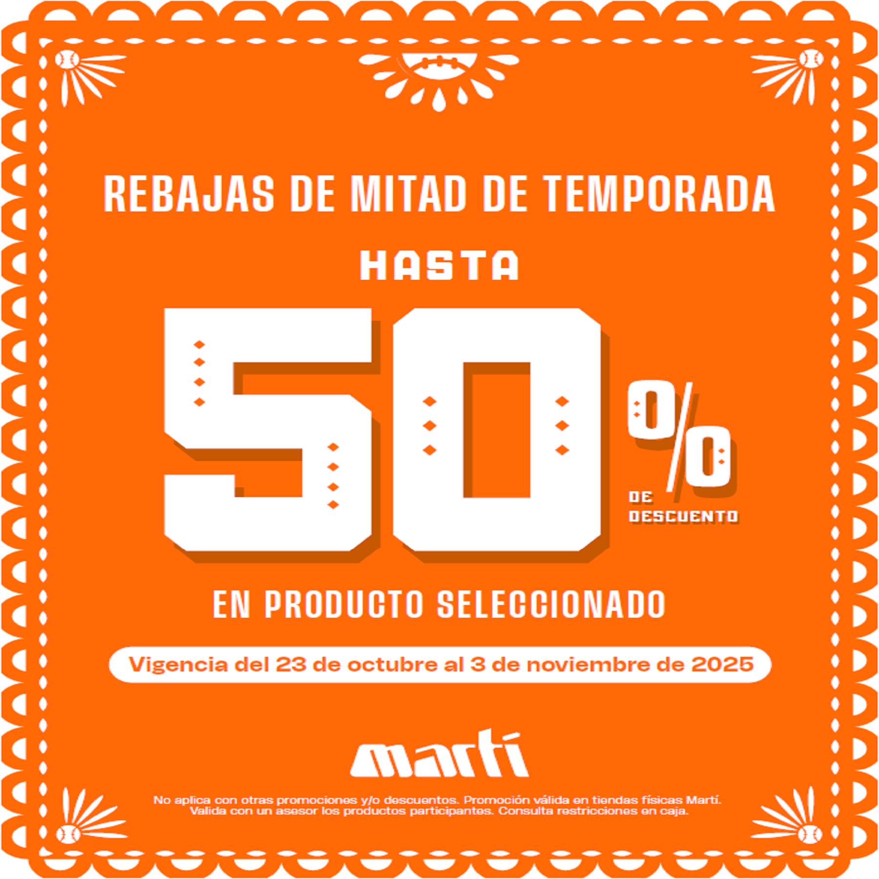 Estoy viendo la promoción de las Rebajas de Mitad de Temporada de la tienda de ropa, calzado, accesorios y equipos deportivos Martí, en la que te ofrecen hasta un 50% de descuento; la promoción aplica en productos participantes, es válida en sus sucursales físicas (que puedes ubicar en éste enlace: marti.mx/ubicacion-de-tiendas) y estará vigente del 23 de octubre al 03 de noviembre de 2025.